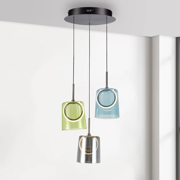 Arte lumínico para salones y comedores: Lámpara colgante LED Zula - 3 luces La lámpara colgante Zula de 3 luces con sus pantallas de cristal en gris ahumado, verde y azul no sólo crea un HighLight visual en salones y comedores, sino que también impresiona por su funcionalidad. La fuente de luz LED integrada promete una combinación de luminosidad duradera y eficiencia energética que se hace notar en cualquier estancia. La lámpara es regulable en altura, por lo que puede adaptarse con flexibilidad a las diferentes situaciones de la habitación y a las necesidades individuales. Con su estilo moderno, la lámpara colgante 3 luces se integra a la perfección en los conceptos de decoración contemporáneos y se convierte en un elemento central del diseño de interiores. La función de regulación integrada permite ajustar la luminosidad de la luz según las necesidades mediante el interruptor de pared convencional, creando el ambiente adecuado para cada situación: desde una luz tranquilizadora para las tardes de relax hasta una luminosidad estimulante para las horas productivas - función de memoria integrada