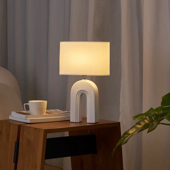 Lámpara de sobremesa Glow of Purity de tela blanca y cerámica beige La lámpara de sobremesa Glow of Purity es una acogedora fuente de luz adicional en el salón y el dormitorio. Su pantalla cilíndrica blanca es de tela. La base, que destaca por su diseño asimétrico con orificio incluido, está hecha a mano en cerámica beige. Incluye cable de enchufe con interruptor.