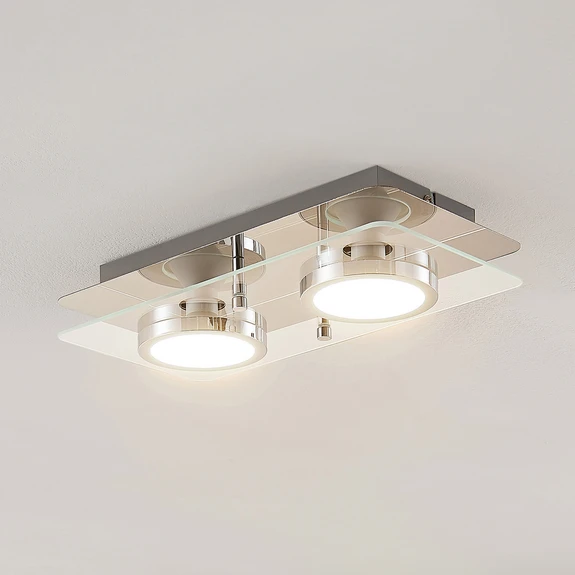 Plafón Gabryl de 2 luces con placa de cristal transparente Las esquinas redondeadas del moderno diseño confieren al plafón LED Gabryl un toque de suavidad. Las dos fuentes de luz, que distribuyen su luz uniformemente y sin deslumbrar en la habitación, están conectadas a la placa base de cromo brillante y atraviesan la placa superior de cristal transparente. Esto crea un cierto aspecto tridimensional, que es la característica especial de esta iluminación de techo. Es ideal para salones, pasillos o incluso el estudio privado.