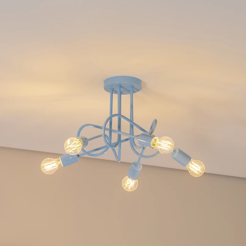 El plafón Oxford en metal azul claro combina un diseño elegante con una iluminación funcional. Los cinco brazos entrelazados se extienden desde el dosel redondo hacia abajo en la habitación y apuntan en diferentes direcciones, de modo que incluso las habitaciones grandes quedan iluminadas con esta lámpara de techo hasta el último rincón.