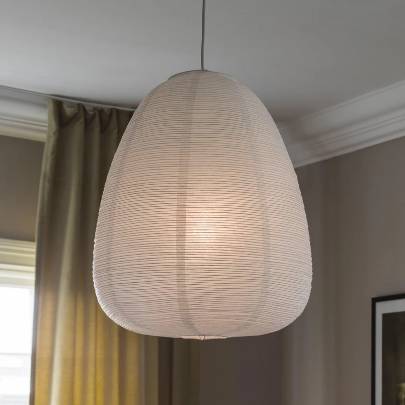 Lámpara colgante Maki con pantalla de papel en forma de huevo La pantalla ovalada, casi en forma de huevo, de la lámpara colgante Maki está hecha de papel con una bonita estructura, a través de la cual la luz brilla en todo el contorno sin deslumbrar.