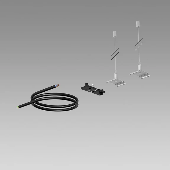 Esta suspensión sirve para utilizar la luminaria de listones Purelite como luminaria colgante. El volumen de suministro del juego de suspensión incluye un soporte de cable metálico con mecanismo de autobloqueo, así como dos cables metálicos (clipables) con 2 m de cable de alimentación transparente, incluido el alivio de tensión.