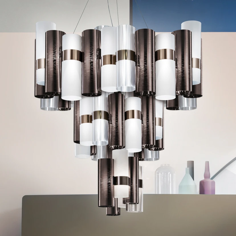 En tres niveles, los elementos cilíndricos se alinean en distintas circunferencias alrededor de un anillo de LEDs en su interior. Los círculos se estrechan de arriba a abajo, creando un efecto de iluminación incomparable. Cada cilindro estrecho y alargado está rodeado por una discreta banda que crea un punto de atracción visual. Además, están abiertas por arriba y por abajo y su naturaleza permite una iluminación de 360º.