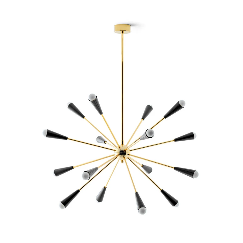 Imponente lámpara colgante Sputnik LED con bombillas E14 reemplazablesLa lámpara colgante Sputnik LED de Stilnovo es una lámpara colgante de diseño fabricada en Italia. Es una explosión formal de luz en todas direcciones e inspira con su estructura de dieciséis brazos fabricada en latón noble con baño de oro galvánico. Los brazos se extienden desde un elemento esférico suspendido del dosel circular.El cálido color blanco de la luz (2.700 K) crea un ambiente acogedor. Destaca la posibilidad de intercambiar las bombillas E14. Con una gran luminosidad, Sputnik se recomienda como iluminación general, también para salas y salones muy grandes.