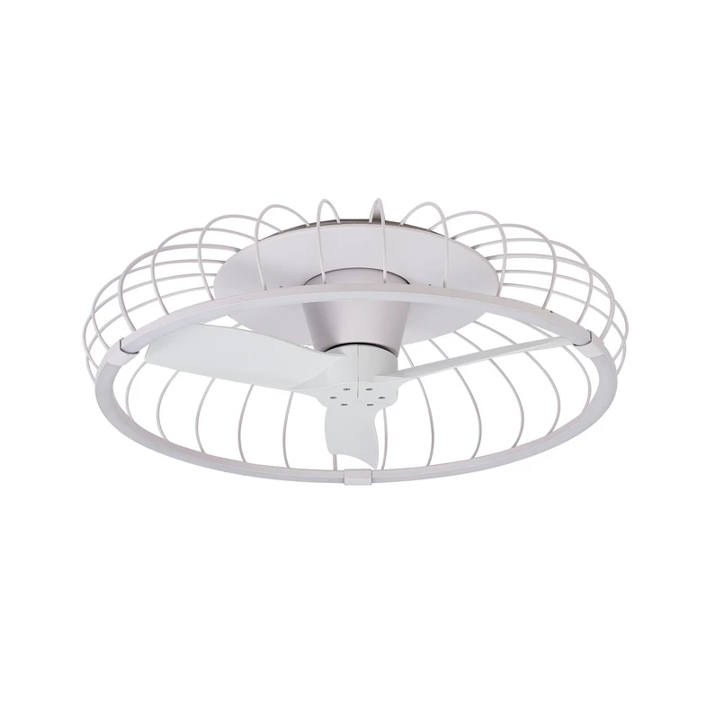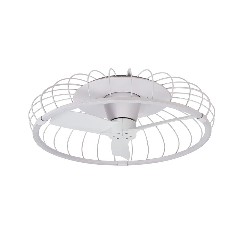 Ventilador de techo LED decorativo Nature en diseño de jaula - se puede controlar mediante App o mando a distancia Este ventilador de techo de tres aspas ofrece todo lo que necesita un ambientador moderno y también está equipado con una fuente de luz LED que se puede atenuar según sea necesario. Puede manejarse mediante App o mando a distancia. Color de la luz infinitamente ajustable entre blanco cálido y blanco universal. Adecuado para habitaciones de hasta 20 m². Funciones El ventilador de techo Natur puede controlarse con el mando a distancia incluido en el volumen de suministro o mediante Bluetooth a través de una App. Se puede ajustar la velocidad, el control CCT de la temperatura del color y la atenuación de la luz. La iluminación LED se puede ajustar de forma continua. Se puede cambiar de funcionamiento hacia delante a funcionamiento hacia atrás, es decir, se puede atenuar la luz. Nature ayuda a ahorrar energía en los meses fríos gracias a la distribución homogénea del aire ambiente calentado - Se puede ajustar el modo de reposo Datos técnicos - Motor de CC (30 W) - Velocidad regulable en 4 niveles (30 %/50 %/ 70 %/100 %): máx. 380 min-1 - Caudal de aire circulante: 104 m³